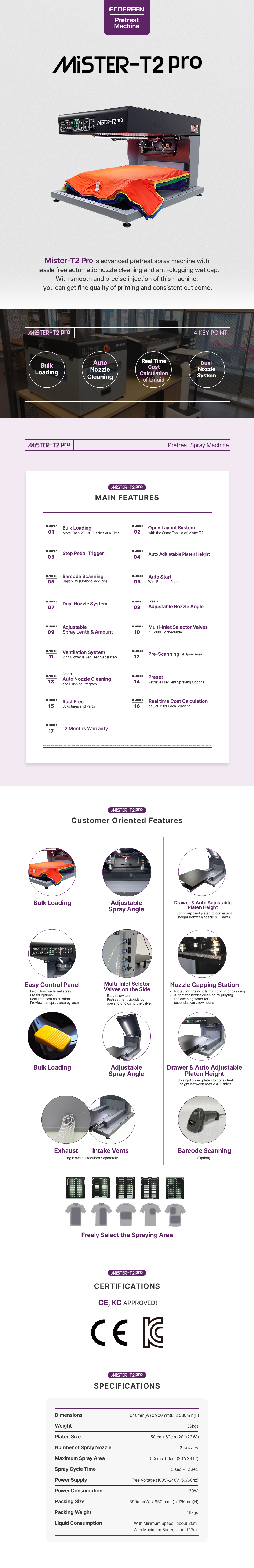 Mister-T2 Pro is advanced pretreat spray machine with hassle free automatic nozzle cleaning and anti-clogging wet cap. With smooth and precise injection of this machine, you can get fine quality of printing and consistent out come.