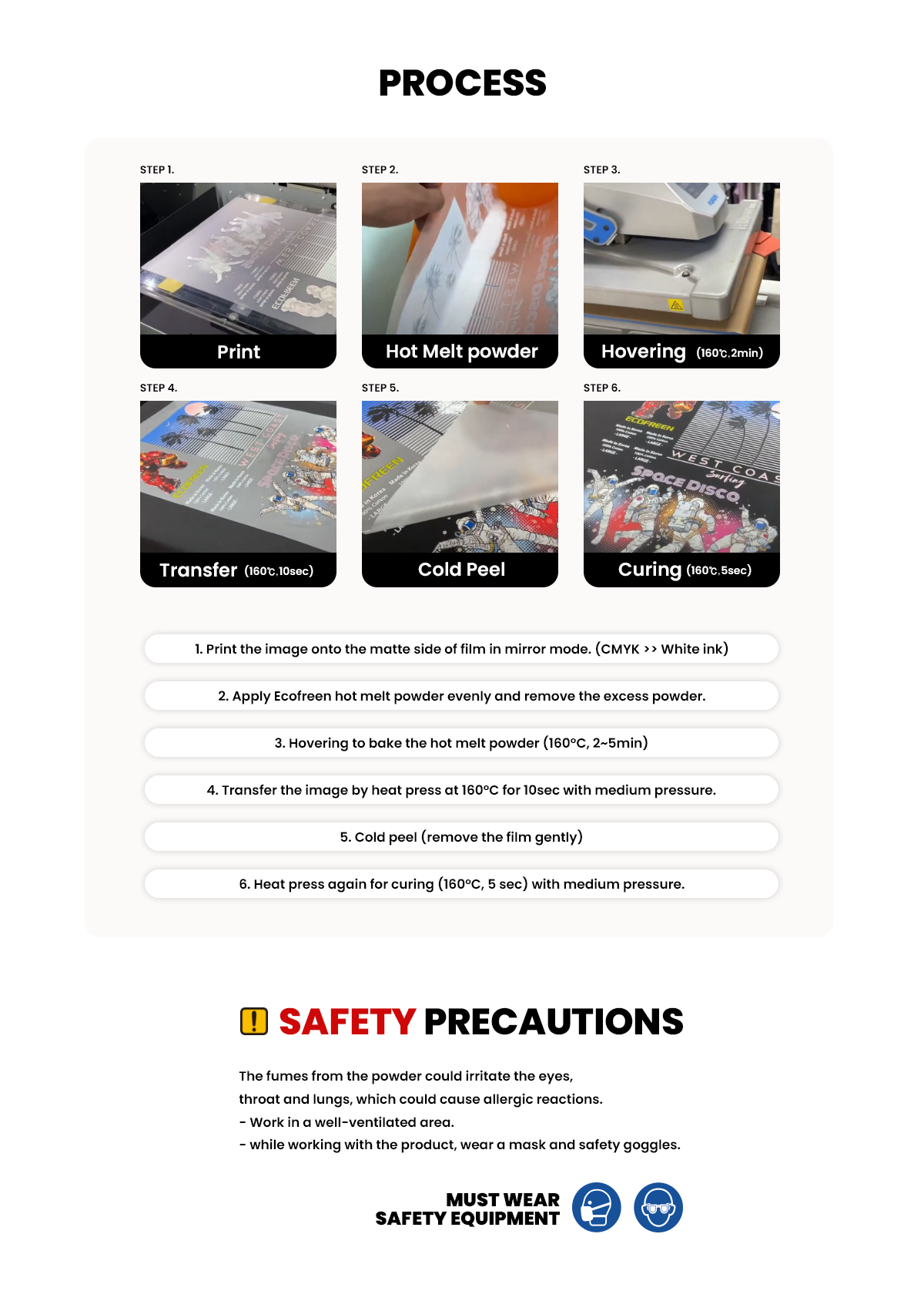 The Extra Stretchable DTF Powder offers exceptional elasticity and superior flexibility, providing a soft and smooth finish.
